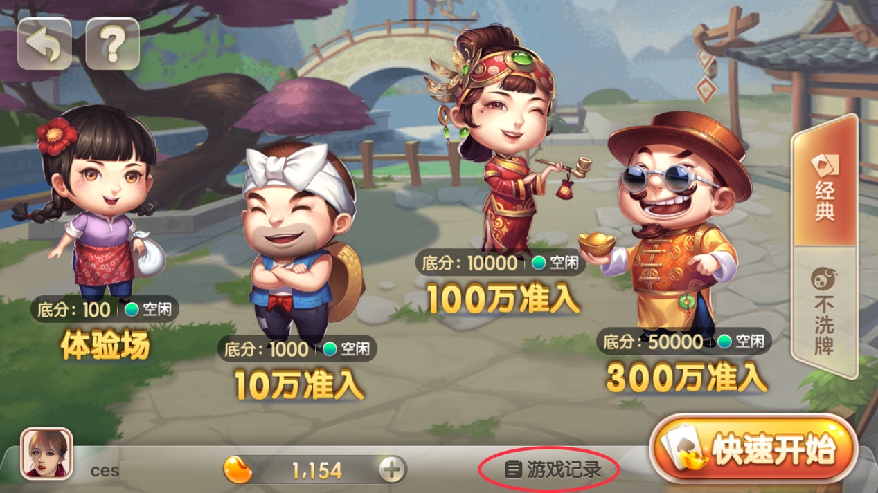 进入一言棋牌分类,点击《斗地主》,进入“经典玩法”或“不洗牌”时,都会在右下角看见“游戏记录”图标,点开除了能看到每局的战绩,还可以查看每局的录像进行回顾。