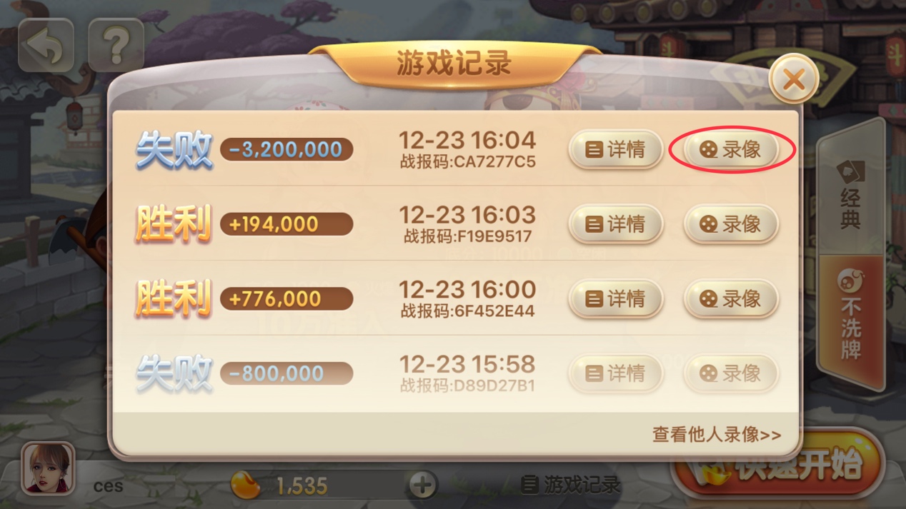 除了可以查看自己的录像,玩家还可以通过输入战报码查看他人的录像。随时随地可以找到大神的对决录像仔细学习,不断提升牌技。
