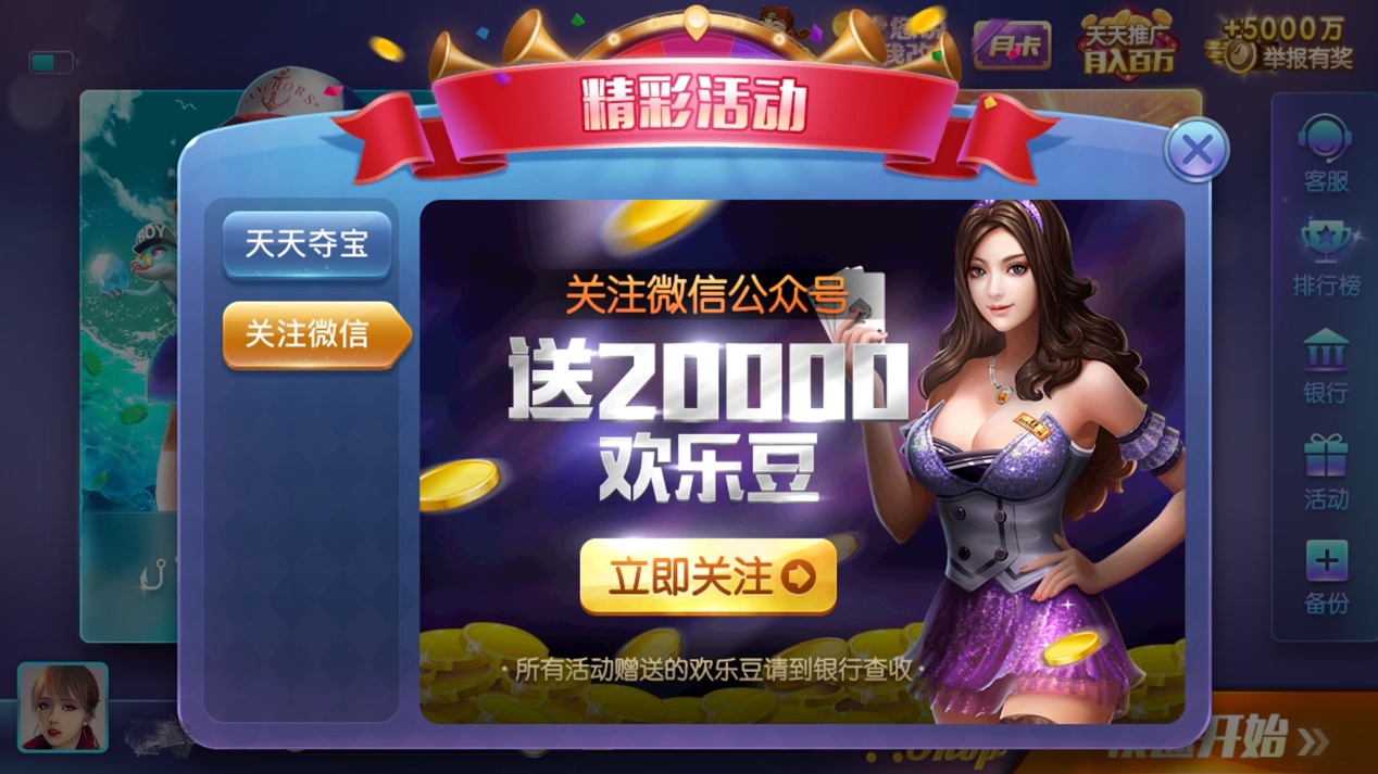 关注公众号可以领取20000欢乐豆,关注公众号后,可以第一时间获知官方活动、游戏攻略、新游上线等消息,还可以参加公众号不定期举行的抽奖活动。